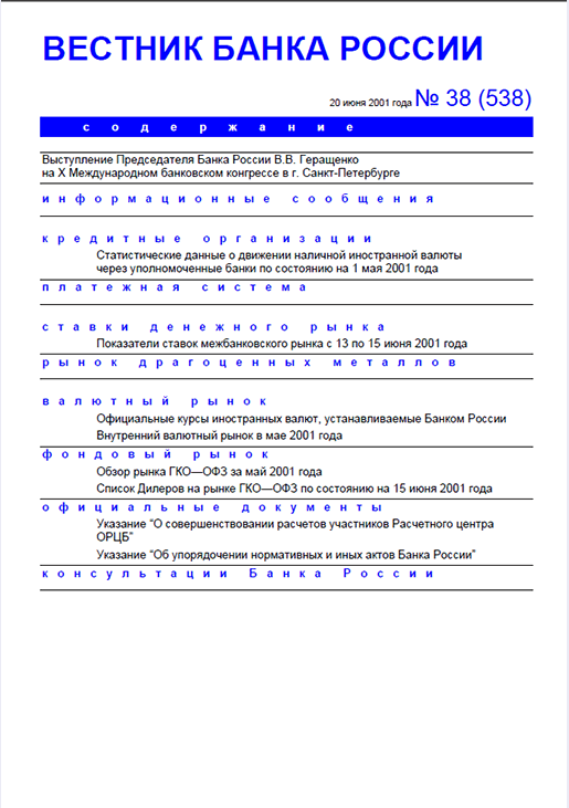 Вестник Банка России / Центральный банк Российской Федерации. — Москва : ПРАЙМ , 2001, N 38. — Москва : ПРАЙМ-ТАСС, 2001.