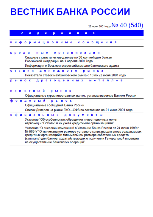 Вестник Банка России / Центральный банк Российской Федерации. — Москва : ПРАЙМ , 2001, N 40. — Москва : ПРАЙМ-ТАСС, 2001.