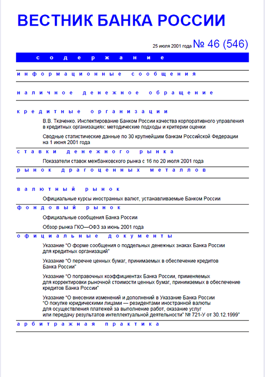 Вестник Банка России / Центральный банк Российской Федерации. — Москва : ПРАЙМ , 2001, N 46. — Москва : ПРАЙМ-ТАСС, 2001.