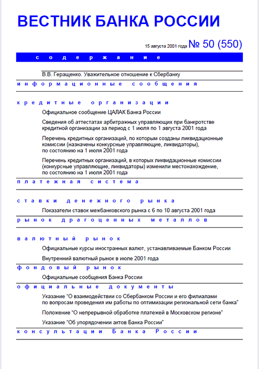 Вестник Банка России / Центральный банк Российской Федерации. — Москва : ПРАЙМ , 2001, N 50. — Москва : ПРАЙМ-ТАСС, 2001.