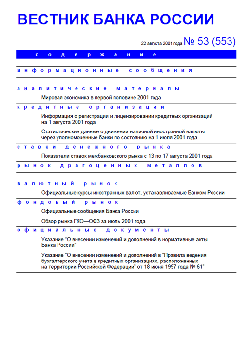 Вестник Банка России / Центральный банк Российской Федерации. — Москва : ПРАЙМ , 2001, N 53. — Москва : ПРАЙМ-ТАСС, 2001.