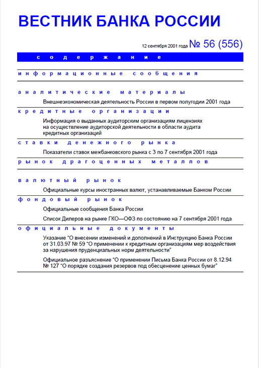 Вестник Банка России / Центральный банк Российской Федерации. — Москва : ПРАЙМ , 2001, N 56. — Москва : ПРАЙМ-ТАСС, 2001.