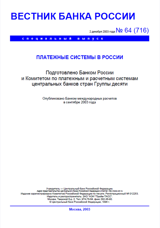 Вестник Банка России / Центральный банк Российской Федерации. — Москва : ПРАЙМ , 2003, N 64. — Москва : ПРАЙМ-ТАСС, 2003.