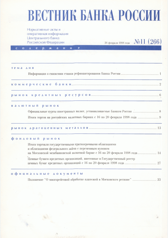 Вестник Банка России / Центральный банк Российской Федерации. — Москва : ПРАЙМ , 1998, N 11. — Москва : ИТАР-ТАСС, 1998.
