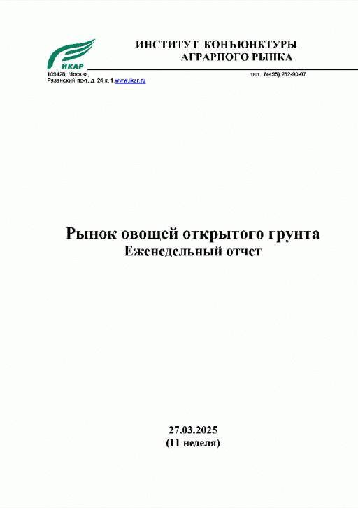 Рынок овощей открытого грунта. — Москва : Институт конъюнктуры аграрного рынка , 2025, N 27.03.2025 (11 нед.). — 2025.